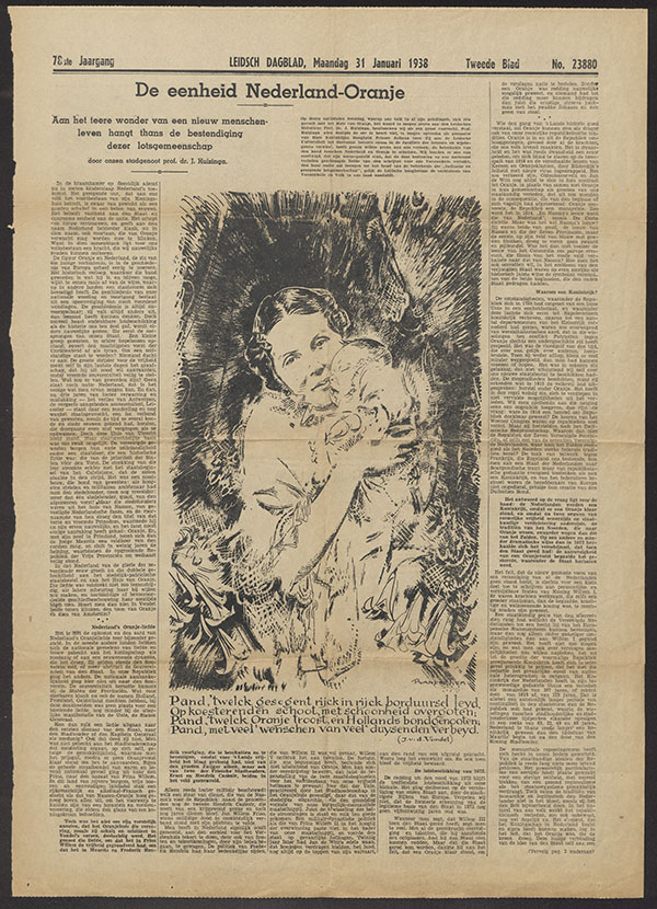 When the Princess married, she invited a German cousin to be a witness, but he was not allowed to leave Hitler’s Germany. The Princess decided to ask Huizinga in his place. She made the phone call herself, and Huizinga accepted. A year later, when the Princess was due to give birth to her first child, Huizinga wrote his ‘De Eenheid Nederland-Oranje’ (The Holland-Orange Bond), which was published in several newspapers. The illustration and the text left in the middle whether the child was a boy or a girl. His article was not about the child itself, but a short history of the bond between the country and its princely, later royal family. It is one of Huizinga’s most euphoric or impassioned articles, neglecting or simply denying any tensions, let alone divisions, in Dutch politics over the centuries. At the end of the article, he used the expression ‘it was a wonder’, characterizing the vicissitudes and qualities of the Dutch state in history, no less than seven times. In his final sentence, he changed this to ‘It is the fragile wonder of a new human life on which now depends the continuation of that beneficial and blessed community of almost four centuries: the bond between the Netherlands and the House of Orange.’