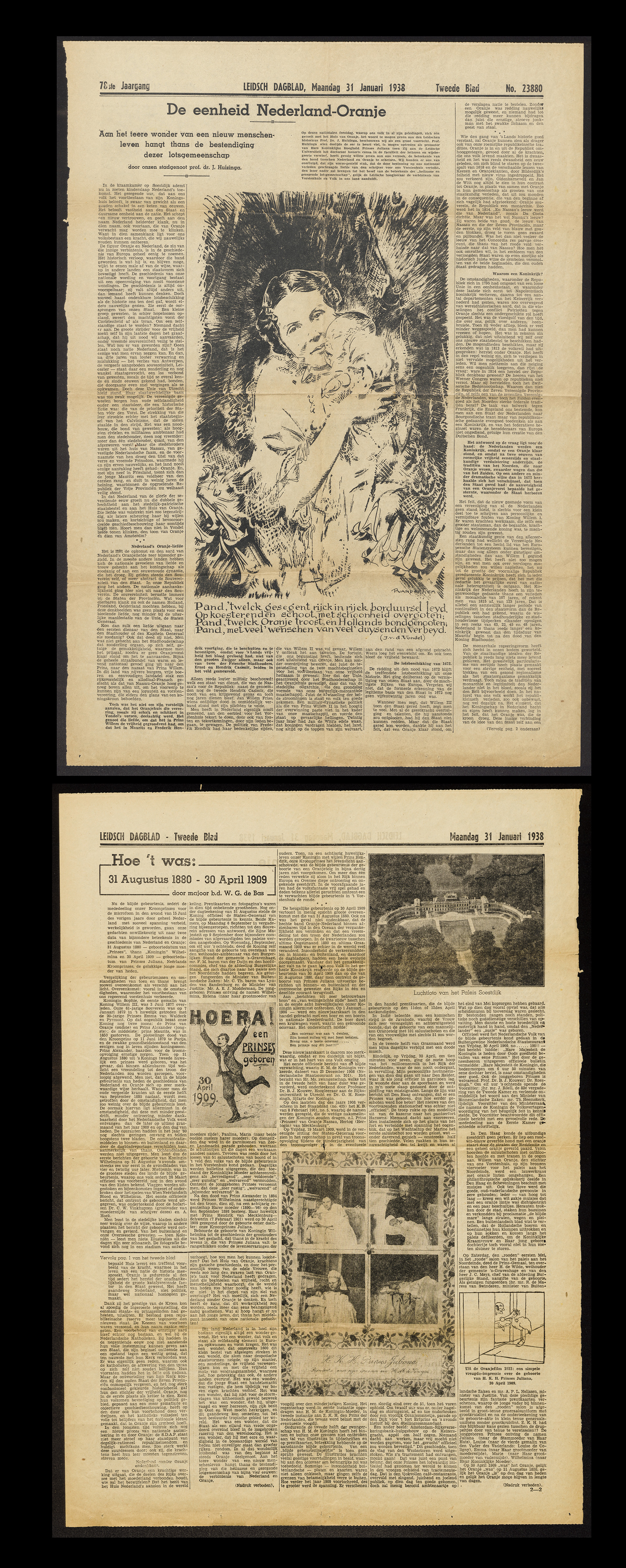 Now we are celebrating the fifth anniversary of the reign of King Willem-Alexander, let us turn our attention to a newspaper article written to mark the birth of the King’s mother, Princess Beatrix on 31 January 1938. At that time, the economic crisis in the Netherlands was severe, unemployment high and the threat of war imminent. Over two generations the royal family, the House of Orange, had consisted of only a few members. Wilhelmina (1880-1962), Queen of the Netherlands 1898-1948, was the only child of her parents, King William III and Queen Emma. After her marriage to Prince Hendrik of Mecklenburg-Schwerin in 1901, she had several miscarriages before giving birth to their only child, Juliana (1909-2004), Queen of the Netherlands 1948-1980. Juliana’s marriage to Bernhard von Lippe-Biesterfeld on 7 January 1937 was intended to be blessed with children to safeguard the Dutch monarchy and, with that, the country itself.