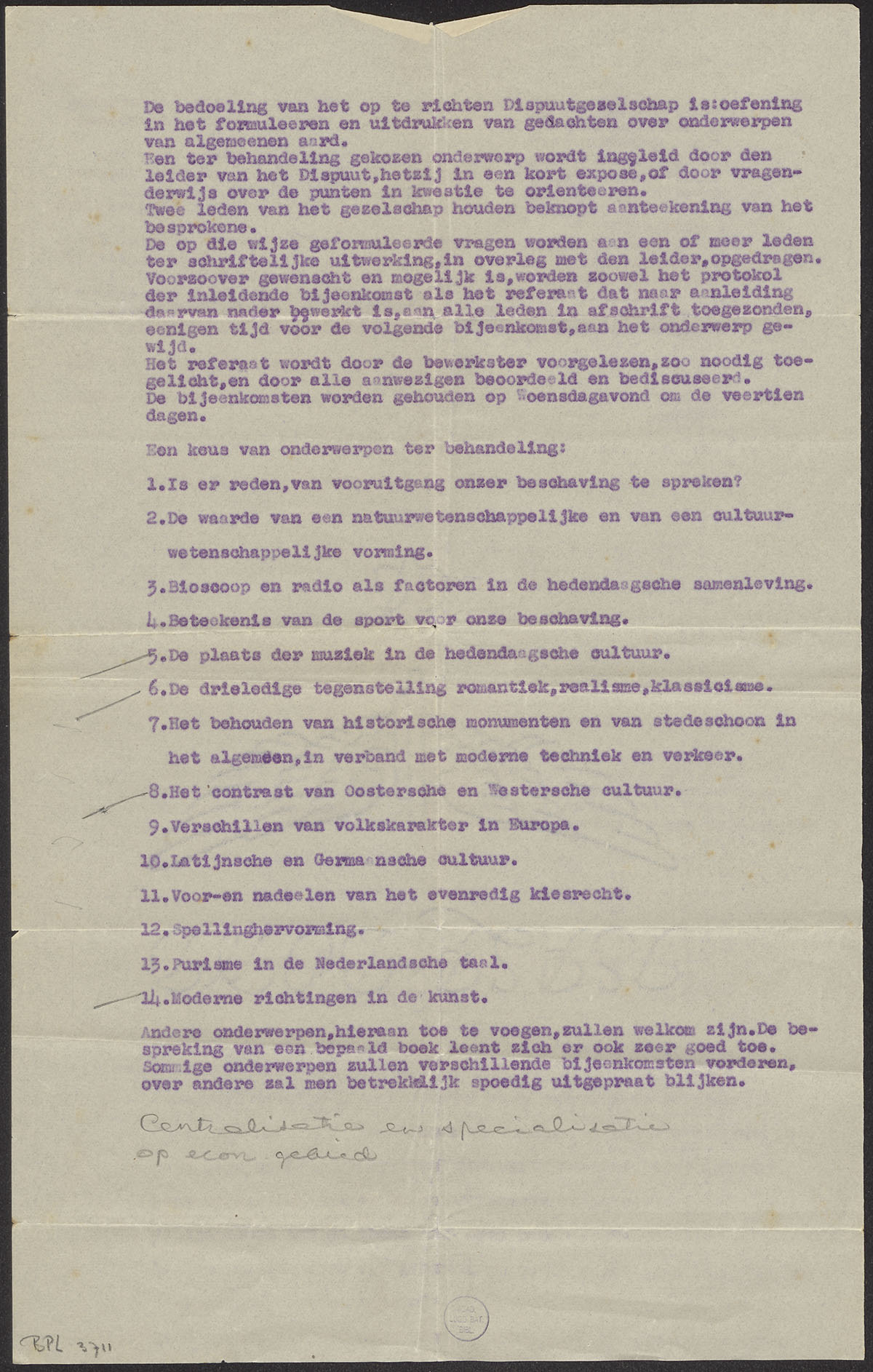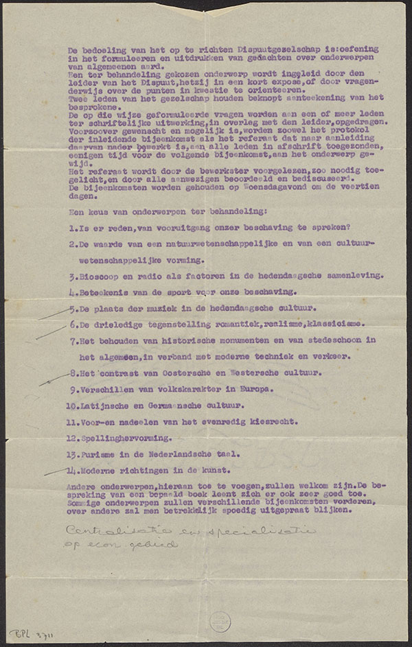 2. Memo on the purpose of the debating club and list of themes, drawn up by Huizinga. The last theme, ‘Centralisation and specialisation in the economy’ is in his own handwriting. Leiden University Library, BPL 3711: 6.