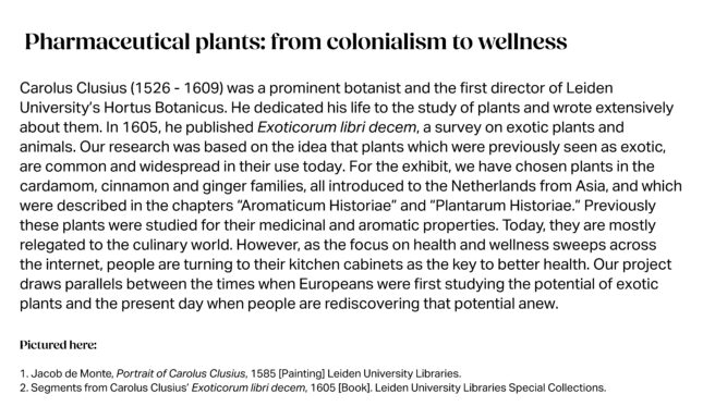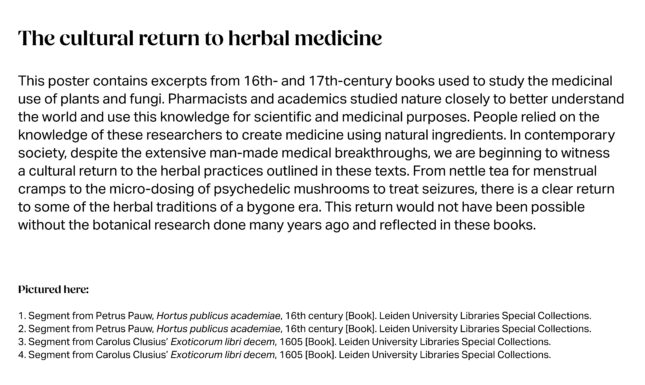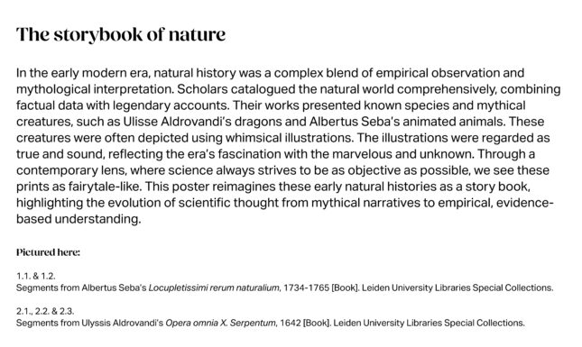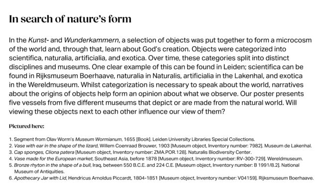 The importance of these manuscripts for scientific, natural and museum history is evident. But how can the artefacts from these collections be used to address a contemporary theme or question? What do these documents reveal about the ways in which knowledge was collected, interpreted and made visible? And how might this be reflected within museum collections today? In a hands-on Museum Lab Workshop, students were prompted to explore these questions after an introduction to a selection of unique printed works by encyclopaedic collections expert Dr. Marika Keblusek. In the creative process that followed, the students worked in groups to develop posters that connected the collection histories and artefacts documented within the studied printed works to a topical issue.